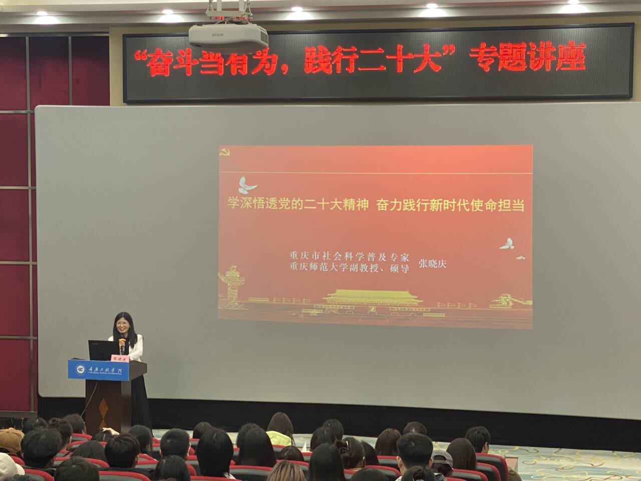 本网讯(文/图 学生科覃薇)为深入学习贯彻党的第二十次全国代表大会精神,深刻领悟党的二十大报告精髓要义。数字艺术学院于11月24日在办公楼报告厅开展“学深悟透党的二十大精神,奋力践行新时代使命担当”主题讲座。本次讲座邀请了重庆师范大学的张晓庆教授主讲。