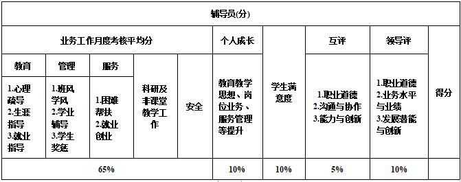 辅导员考核指标由业务工作月度考核平均分、个人成长、学生满意度、互评、领导评五个维度9项专项构成,具体如下: