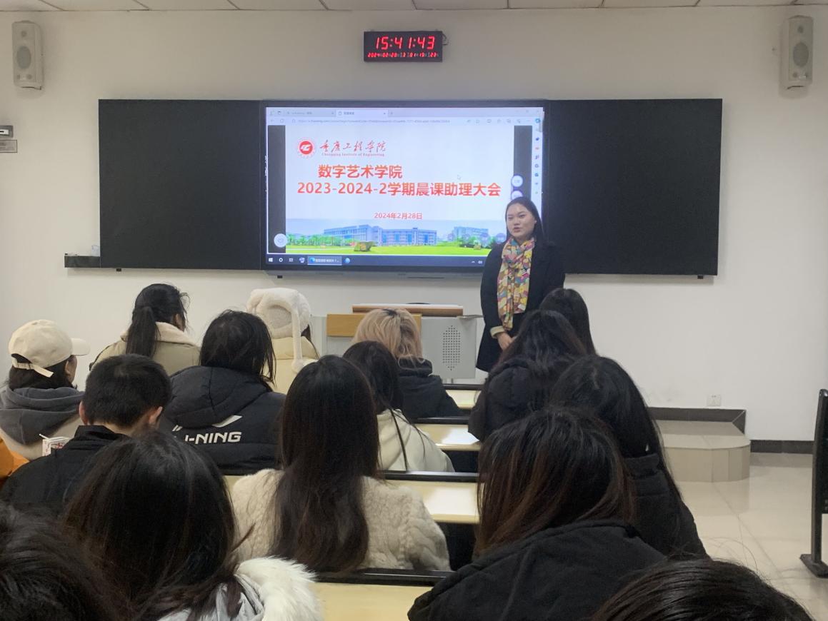 本网讯(图 文/黎小莹),随着新学期的到来,数字艺术学院于2024年2月28日15:40在六教209教室成功开展了2023-2024-2学期晨课助理大会。本次会议的目的是明确本学期晨课主题、规划未来,旨在帮助晨课助理理清思路,明确新学期关于晨课的的学习计划和目标,确保学生们能够顺利开启新学期的学习生活。