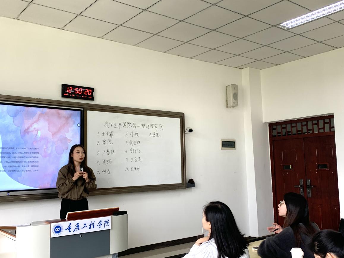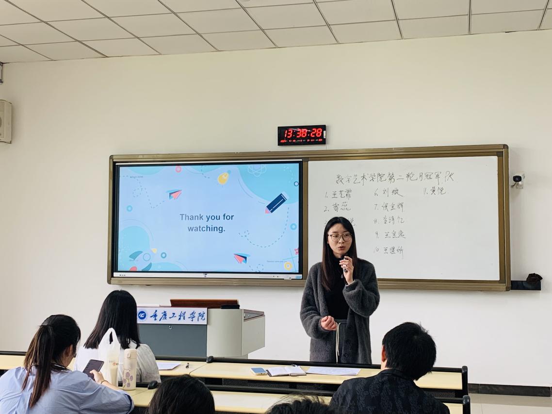 本网讯(文/图 覃薇)为锻炼选手的演讲能力,提高心理素质,展现演讲风采,4月19日中午,数字艺术学院第二轮月冠军比赛在第六教学楼6101教室正式举行。本次晨课由晨课助理万如意同学主持,22级全体辅导员任评委。