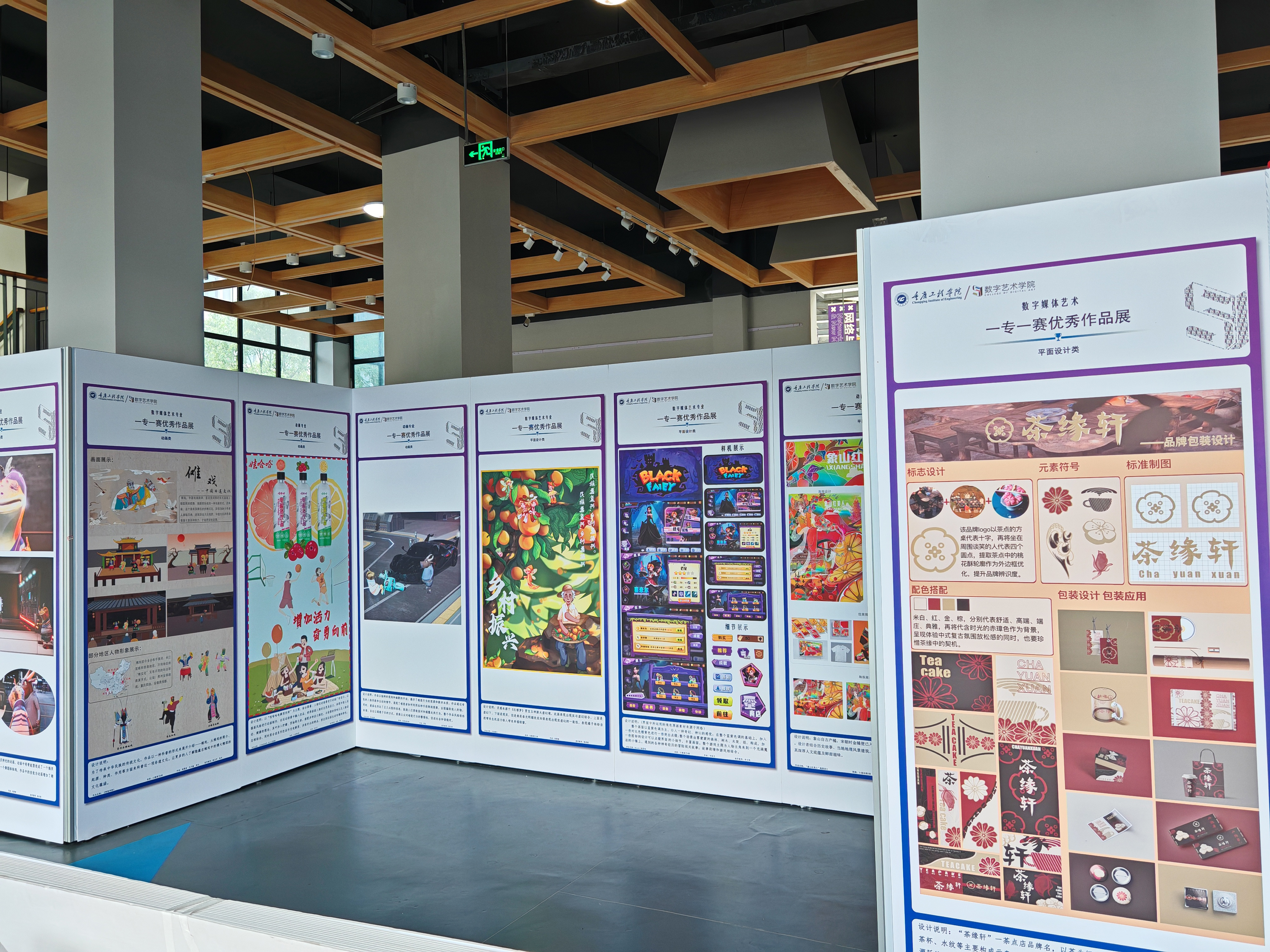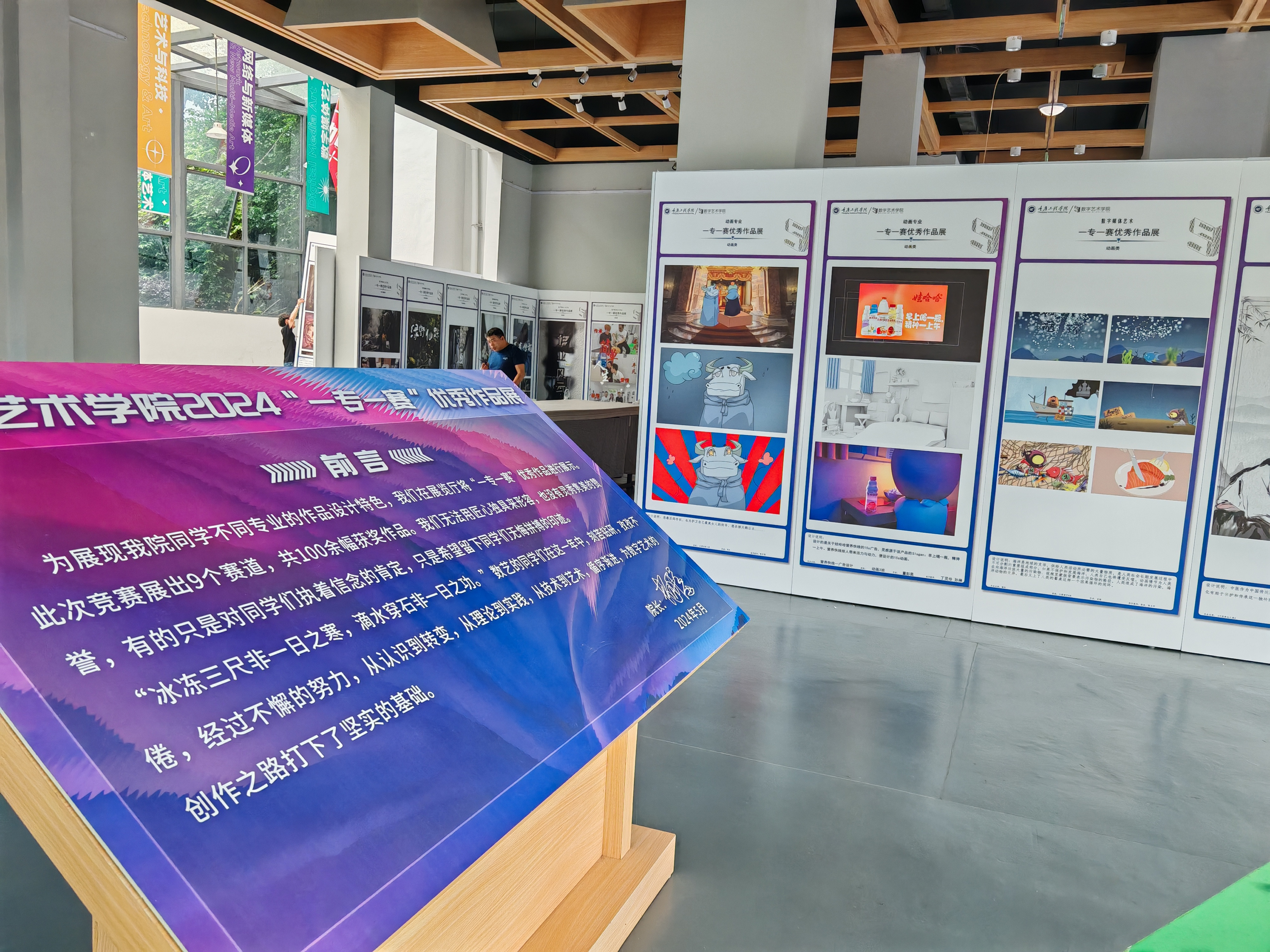 为推动我院专业教育的纵深发展,展现学生的设计水平、丰富学生的课余文化活动,由教务处主办数字艺术学院承办的“一专一赛”优秀作品展于2024年5月27日上午在五教艺术展览馆大厅正式展出。 本次技能竞赛共10个赛道,361名数字艺术大二大三同学参与竞技,共展出100余幅优秀作品。此次展出作品题材丰富,涉及动画、视频、虚拟IP、表情包、数字绘画、平面涉及、人居环境规划、AICG、游戏、数字摄影等作品。学生创作作品在涉及创意、色彩搭配、个人风格及表现手法等方面都有大胆的创新和探究,更多的体现了作品是由灵感创意余动手能力的完美结合。 通过此次技能竞赛作品展活动,不仅开阔了学生视野,也培养和提高了学生的艺术鉴赏能力。这些优秀作品,给师生们带来了美的享受,加强了同学们对艺术的理解,为同学们创作了良好的艺术欣赏和交流平台,为构建艺术学院更好的明天做充分的准备。