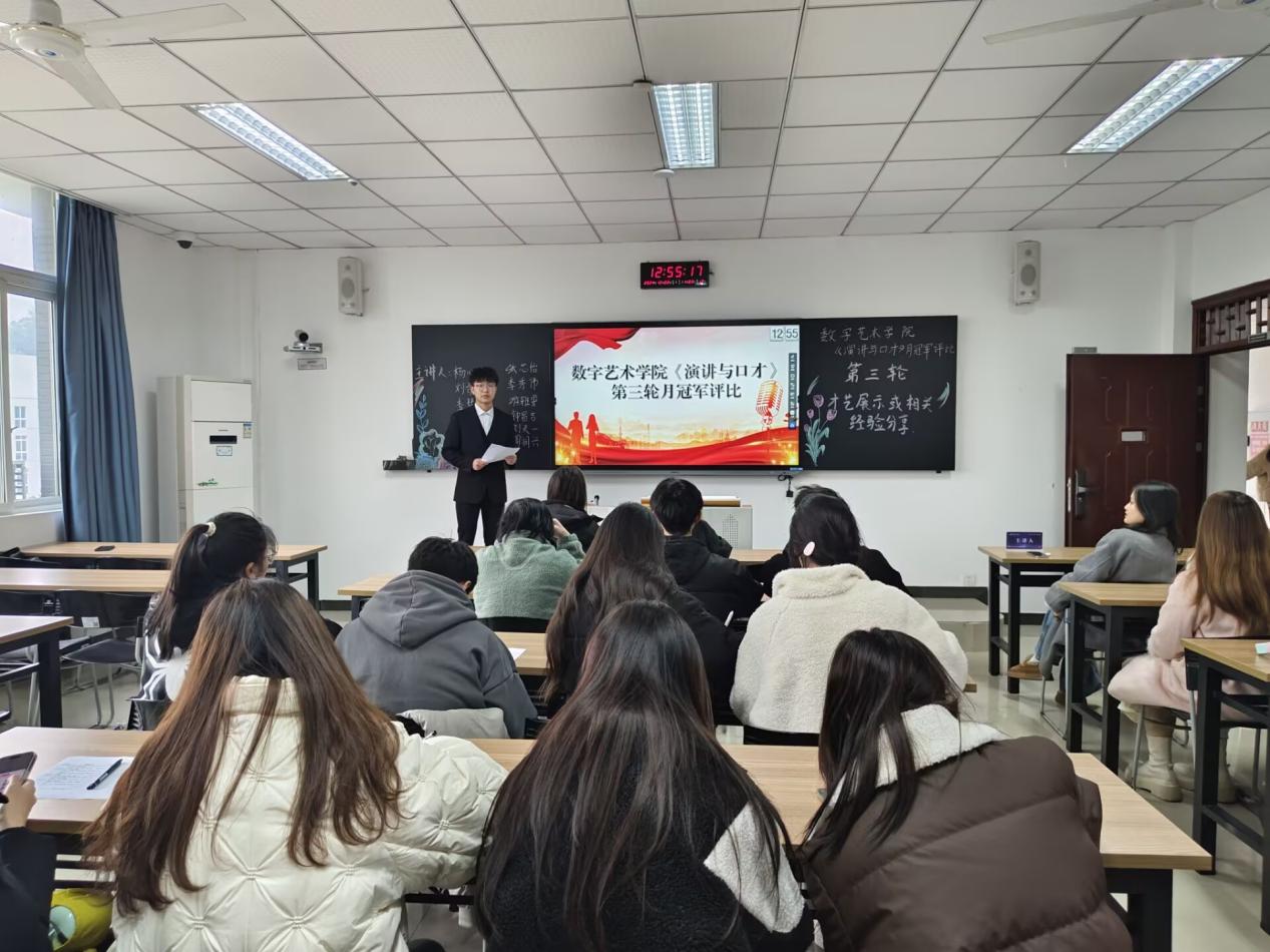 本网讯(文/王奕评 谭净 图/王奕评)12月2日中午,数字艺术学院在第六教学楼520教室开展数字艺术学院《演讲与口才》第三轮月冠军评比活动。辅导员老师谭净、张芬源与本月的月冠军得主以及一众学生评委共同参加。