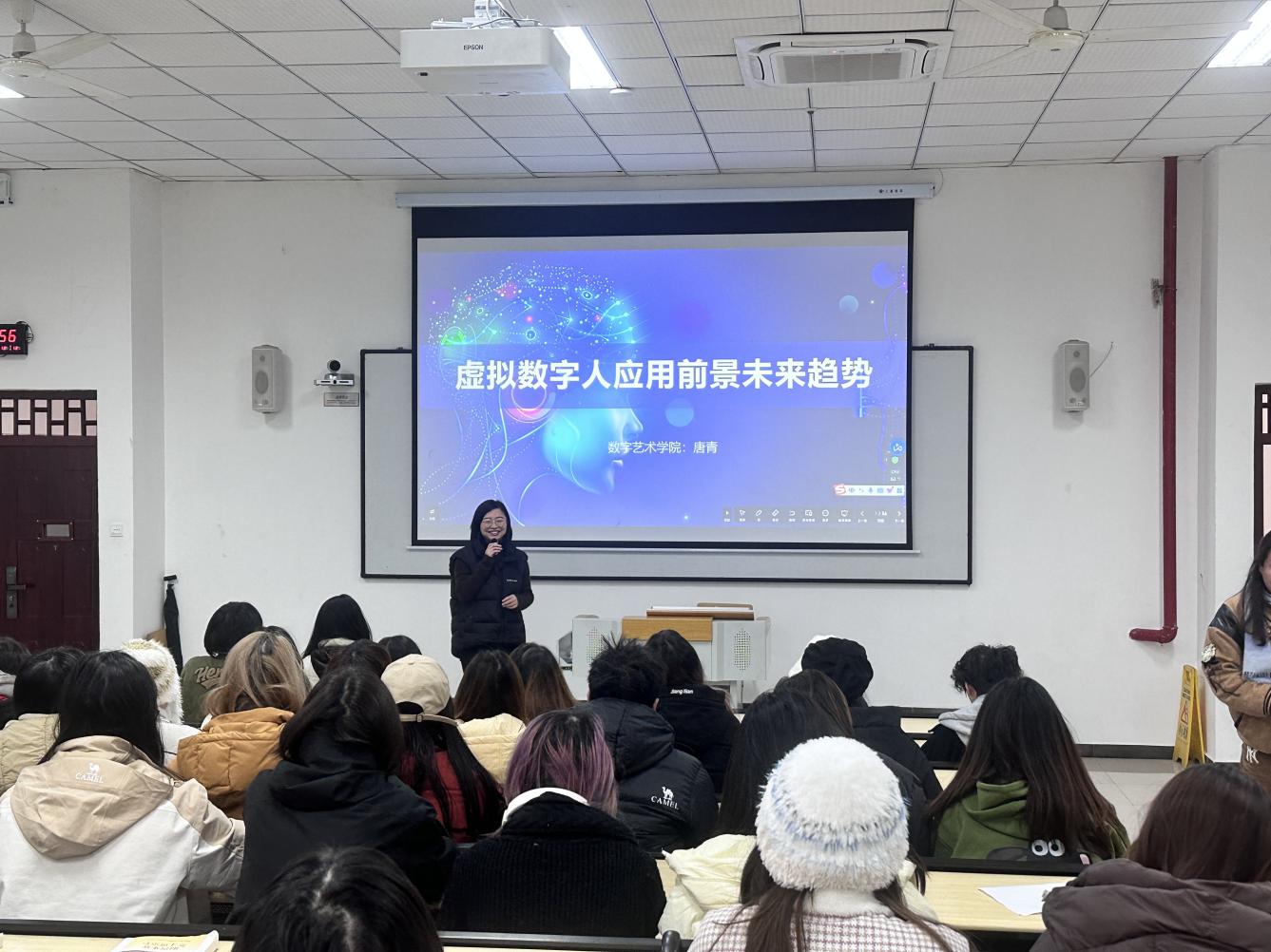 本网讯(文/图 设计系唐青)12月18日,数字艺术学院在第六教学楼204教室开展“虚拟数字人应用前景未来趋势”主题讲座,本次讲座由专业教师唐青主讲,吸引了学院200余名同学积极参与,现场气氛热烈。