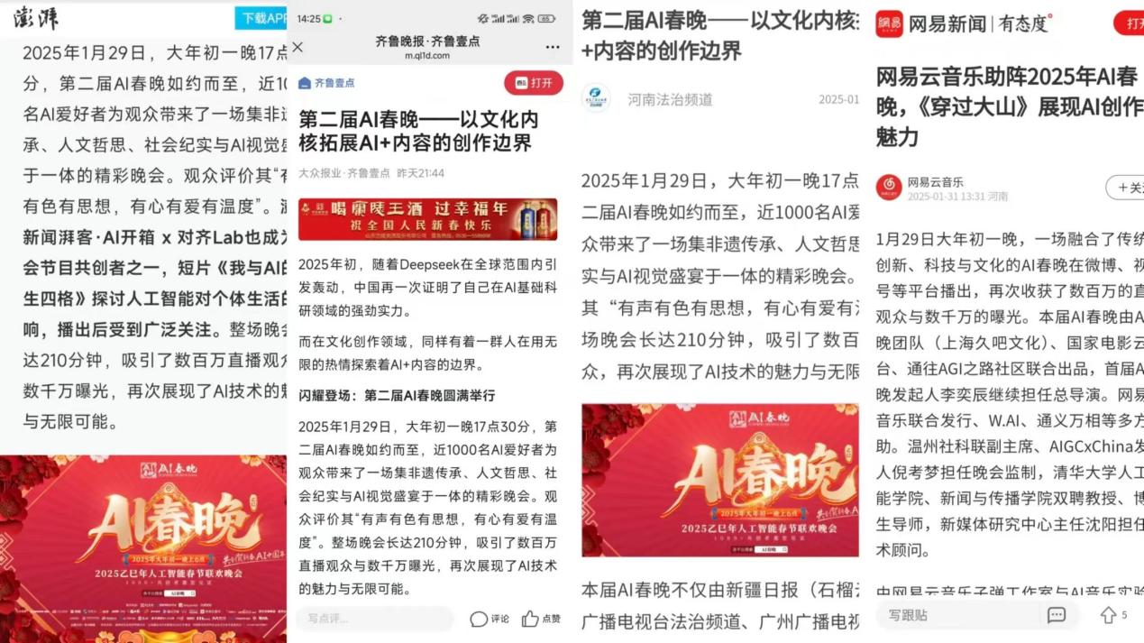 本次网络春晚举行于1月29日大年初一晚。融合了传统与创新、科技与文化的AI春晚在微博、视频号等平台播出,本次AI春晚为第二届,再次收获了数百万的直播观众与数千万的曝光。本届AI春晚由AI春晚团队(上海久吧文化)、国家电影云平台、通往AGI之路社区联合出品,由首届发起人李奕辰继续担任总导演,网易云音乐、通义万相等企业提供技术支持。温州社科联副主席、AIGCxChina发起人倪考梦担任晚会监制,清华大学人工智能学院、新闻与传播学院双聘教授、博士生导师,新媒体研究中心主任沈阳担任学术顾问。国内多加网络媒体对此次AI春晚进行报道。