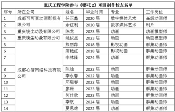 在这部电影辉煌成就的背后,有一批来自重庆工程学院的杰出校友默默贡献着自己的力量。重庆工程学院数字艺术学院动画和数字媒体艺术专业的14名校友,包括任正鑫、余红利等,参与了《哪吒之魔童闹海》的制作。据悉,他们分别在诸如成都可可豆动画影视有限公司、成都心智网络科技有限公司等业内知名公司担任关键职位,为《哪吒2》的成功制作提供了专业支持。他们通过在学期间接受的系统教育和实践训练,以及学校与企业间紧密的合作模式,掌握了先进的技术和工作方法,并培养了卓越的团队协作能力。