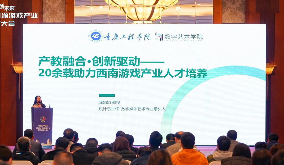 在此次论坛中,陈娟娟教授作为重庆工程学院的代表,发表了主题演讲。她结合游戏产业的创新发展与教育合作,分享了数字艺术学院在游戏人才培养、产教融合等方面的经验与成果,详细阐述了如何通过产教融合和跨界交流推动游戏产业的协同发展。