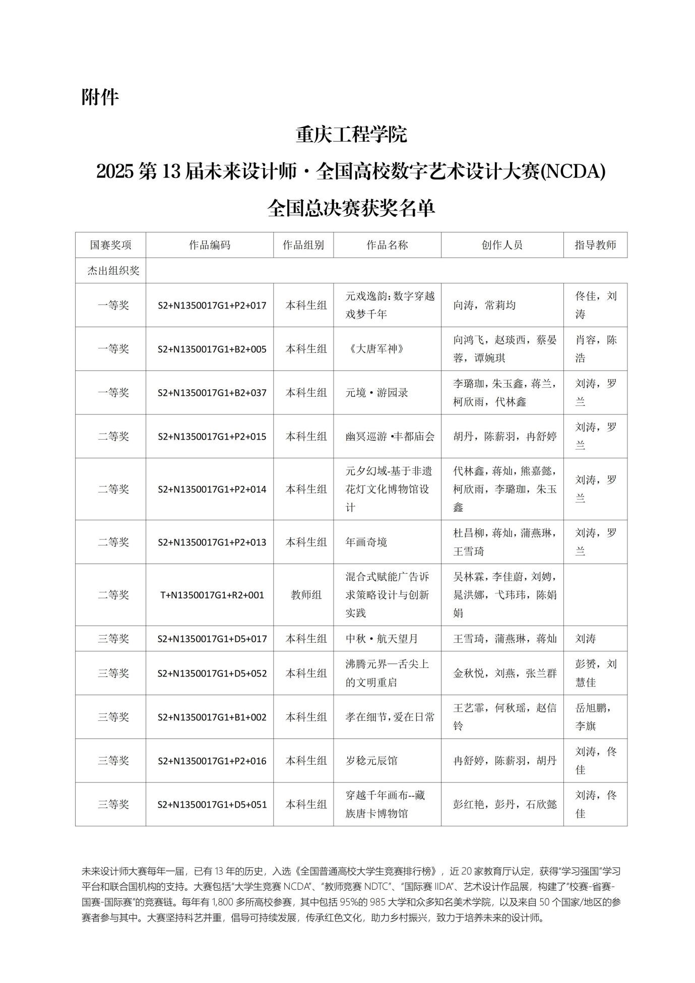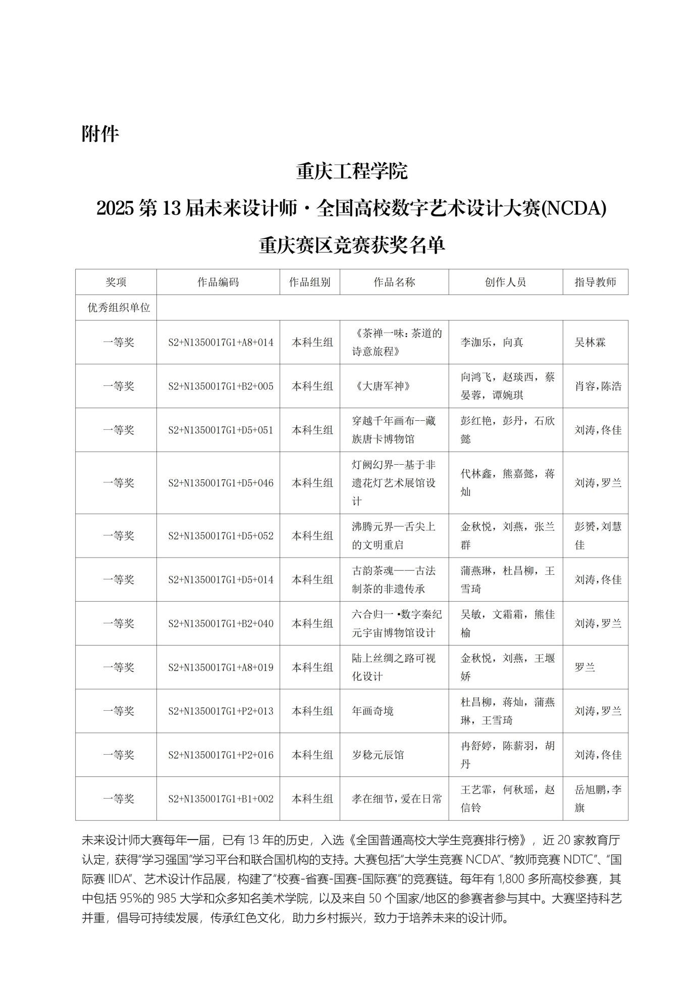 本网讯(文/图 数字艺术学院 刘涛)近日,2025年第13届未来设计师・全国高校数字艺术设计大赛(NCDA)重庆赛区竞赛与全国总决赛结果先后揭晓。重庆工程学院数字艺术学院师生凭借扎实的专业功底与创新实践能力,在赛事中表现突出,不仅斩获重庆赛区“优秀组织单位”、全国总决赛“杰出组织奖”,更在个人与团队奖项中收获颇丰,彰显了学院在数字艺术设计领域的教学实力与人才培养成效。
